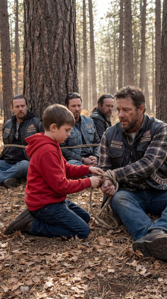 Neljä miestä istui jättimäisen männyn alla, kädet kahlehdittuina puuhun. Heidän vaatteensa olivat repaleiset, heidän kasvonsa mustelmilla, heidän ruumiinsa roikkuivat väsymyksen painosta. He eivät enää kamppailleet. He näyttivät miehiltä, joiden voimat olivat ehtyneet.