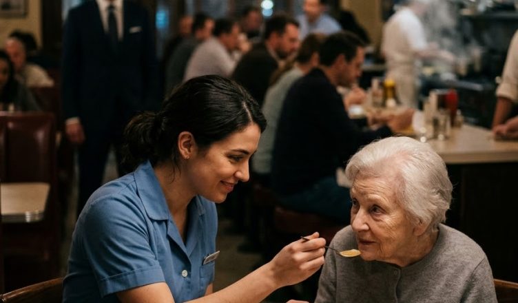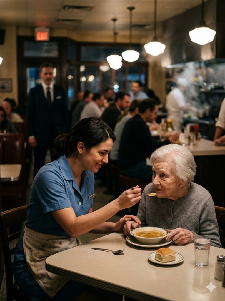 Kun hän palasi, hän ei ollut tuonut samaa lautasta. Hänen käsissään oli kuumaa keittoa, kevyempää ja herkempää vaihtoehtoa. Ilman sen enempää puhetta, pelkäämättä ympärillään olevaa hälinää, hän istuutui naisen viereen ja alkoi auttaa häntä hitailla, kärsivällisillä liikkeillä, ikään kuin maailma voisi odottaa.