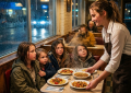 Tarjotin osui pöytään terävällä, metallisella tömähdyksellä. Thomas ei nostanut katsettaan heti. Hän asetti hampurilaisen paahtoleivälle, lisäsi juuston taitavasti ja katsoi sitten ylös.
