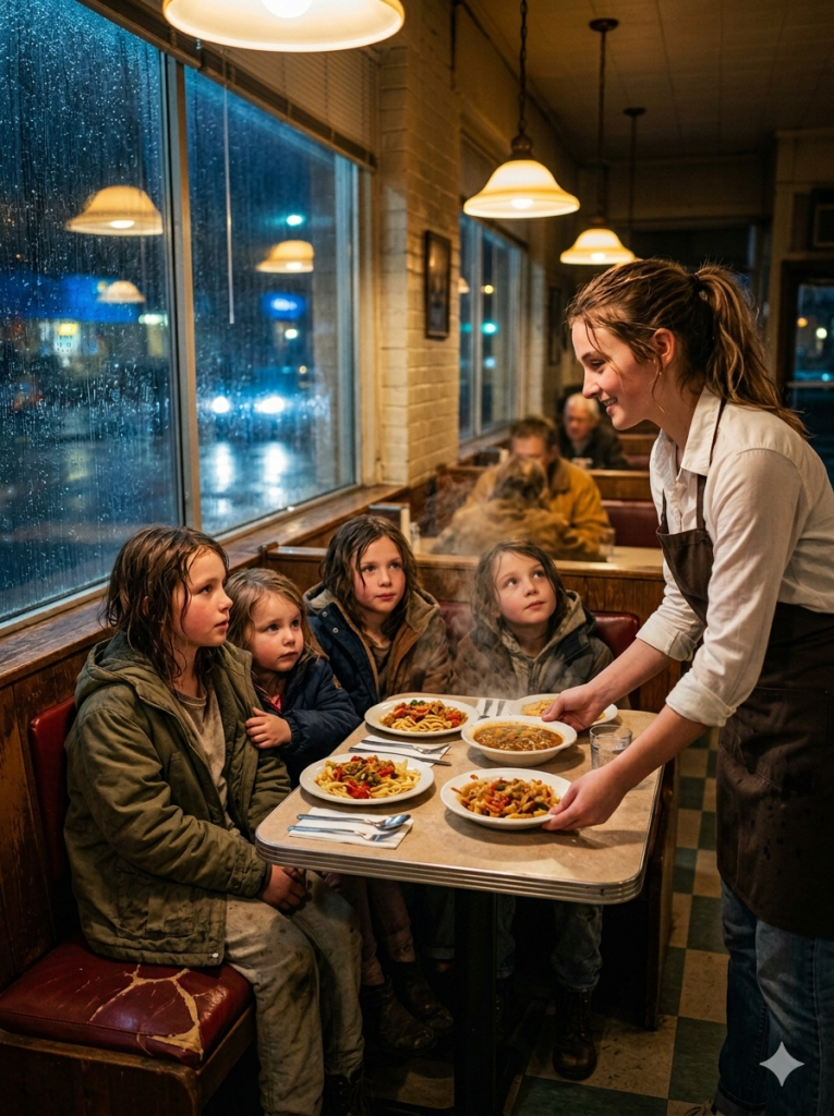 Kahvilan lämmin ilma kietoi heidät ympärilleen kuin pehmeä peitto. Emily istutti heidät ikkunan viereen, meni keittiöön ja palasi pian neljän lautasellisen lämmintä ruokaa kanssa.
