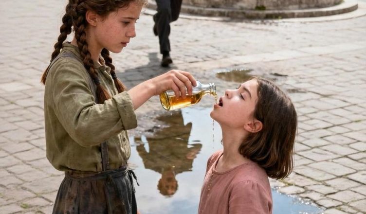 Tyttö veti kärrystä pienen lasipullon, jossa oli sameaa meripihkanväristä nestettä.