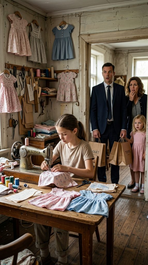Tyttö ei nostanut päätään. Hänen sormensa ohjasivat varovasti kulunutta sinistä kangasta neulan alla, ja hänen leukansa oli puristettu liian raskaaseen keskittymiseen, joka ei sopinut lapsille.
