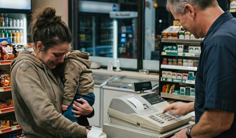 Lähestyessään tiskille hän asetti lapsen varovasti niin, että tämä ojensi kätensä kassiin. Aloin laskea rahaa – maitoa, leipää, vaippoja.